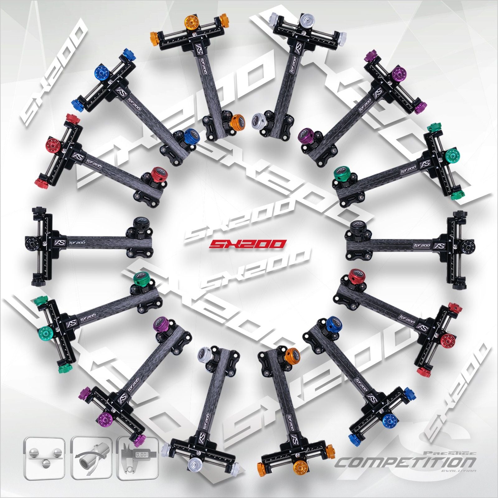 The top of the range compound sight from Arc Systeme is also available with a shorter extension arm and a more compact frame. The SX200 SHORT features a 6 inch carbon extension arm. This model does not include SX35 Scope Mount.
