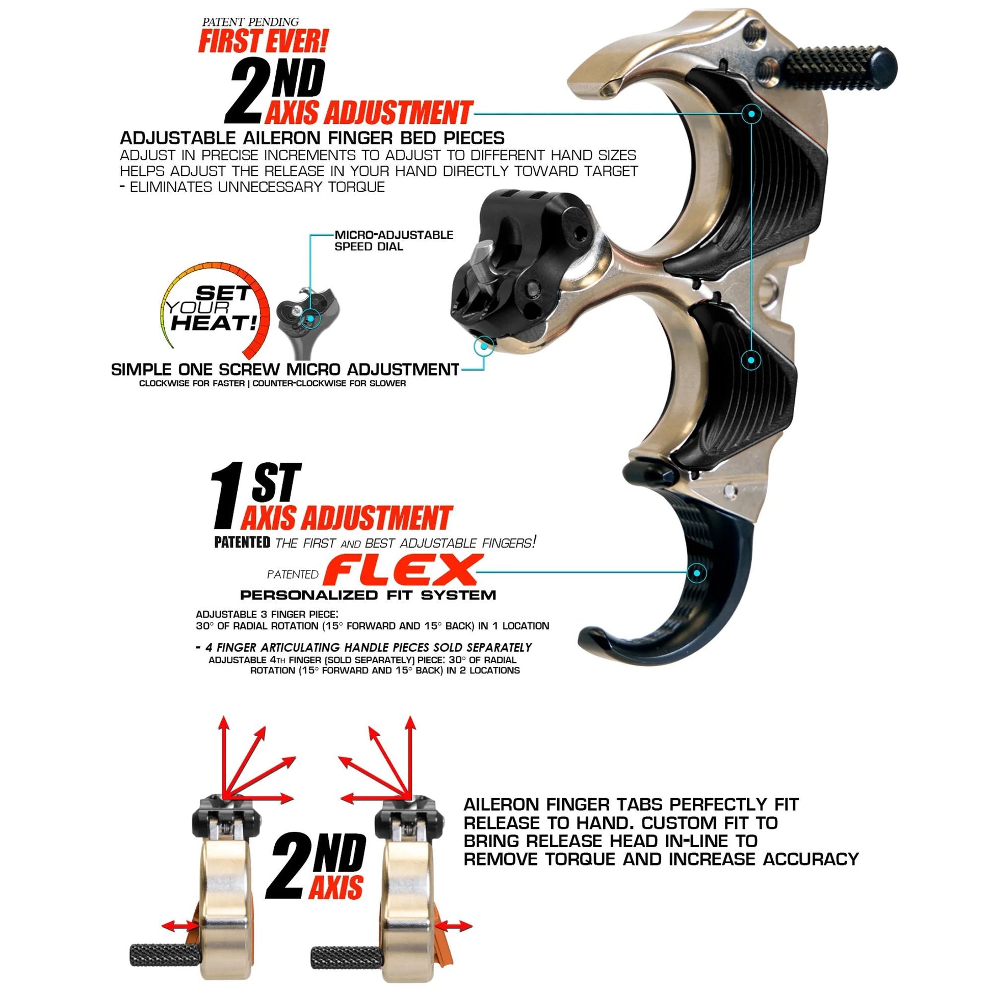 The Aileron technology helps adjust the release in your hand directly toward the target in the first ever 2nd axis adjustment for a release aid while eliminating even more unnecessary torque.
